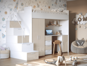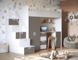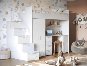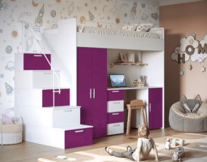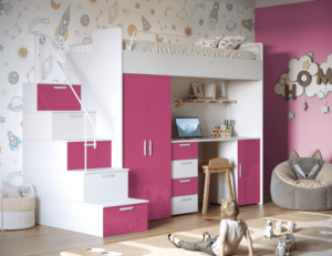 Antresola łóżko z biurkiem szafa schody Biały + Różowy Połysk 4s KM