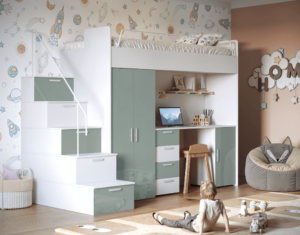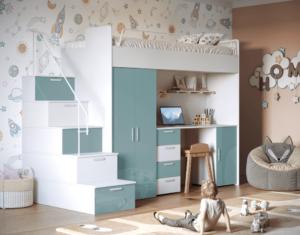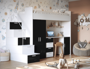 Górne łóżko wyposażone jest w barierkę ochronną. Schodki łóżka mogą służyć jako praktyczne schowki. Przy montażu można określić stronę wejścia lewo – prawo.