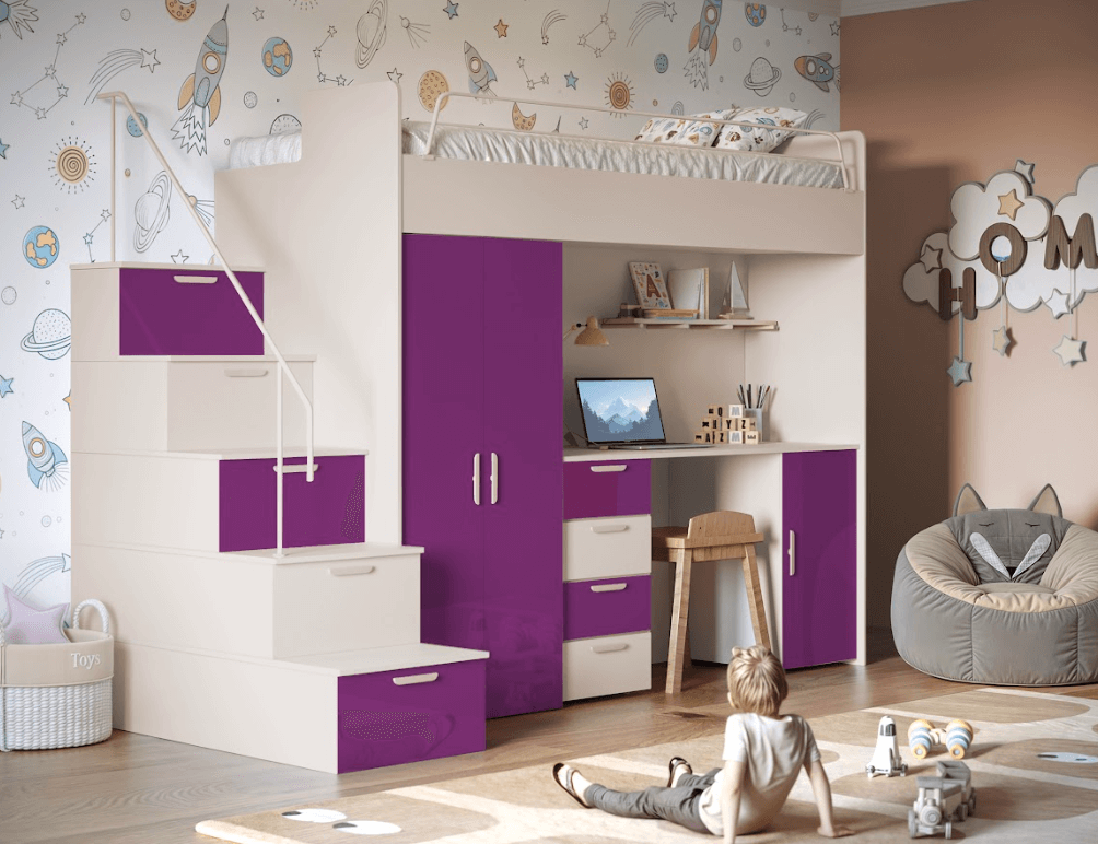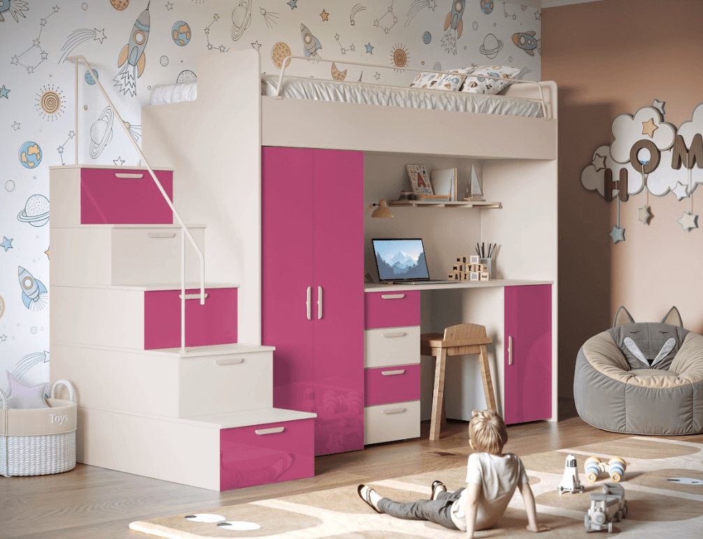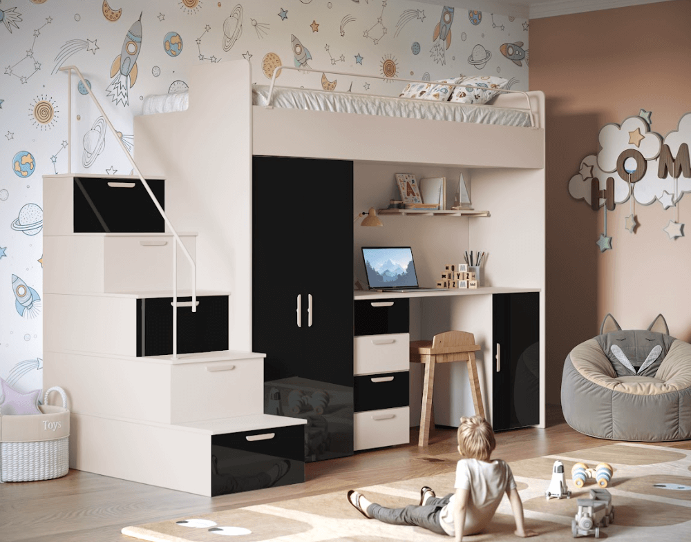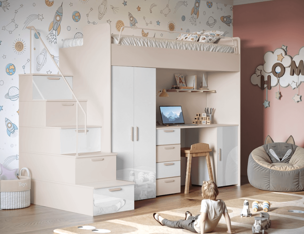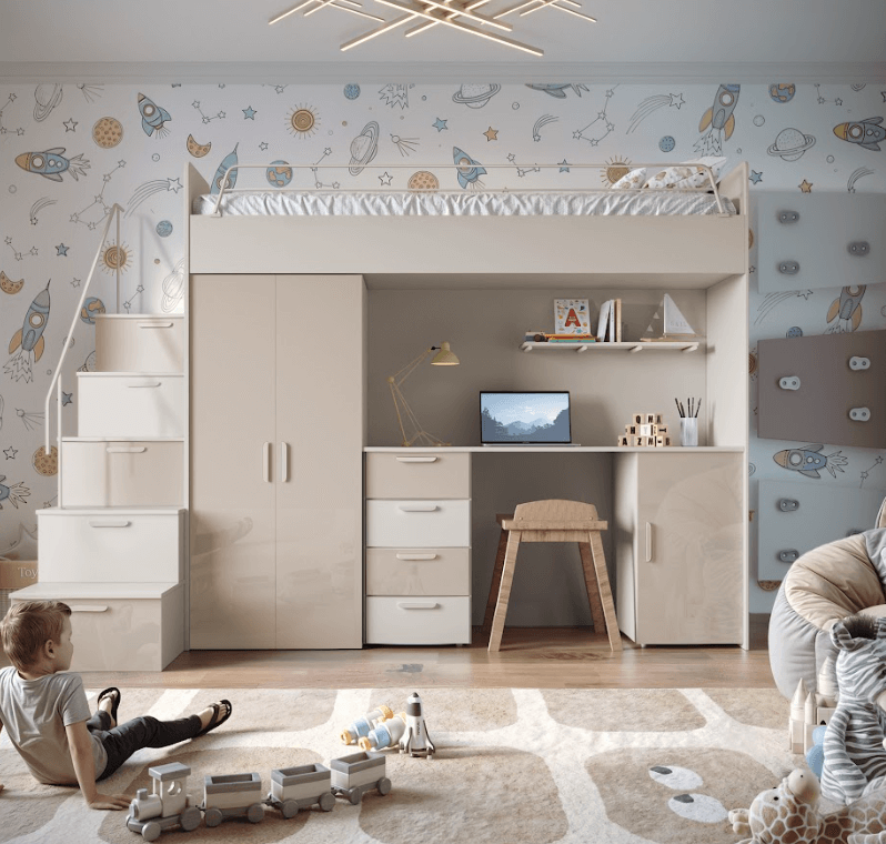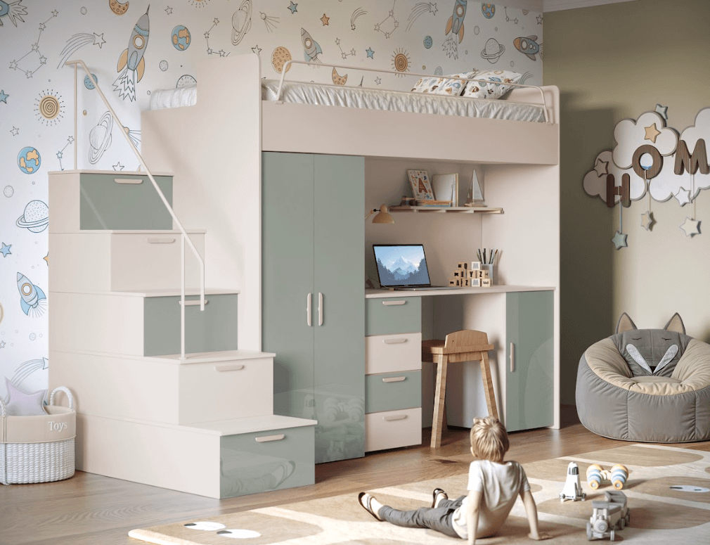 Antresola łóżko z biurkiem szafa schody Kaszmir + Mięta Połysk 4s KM