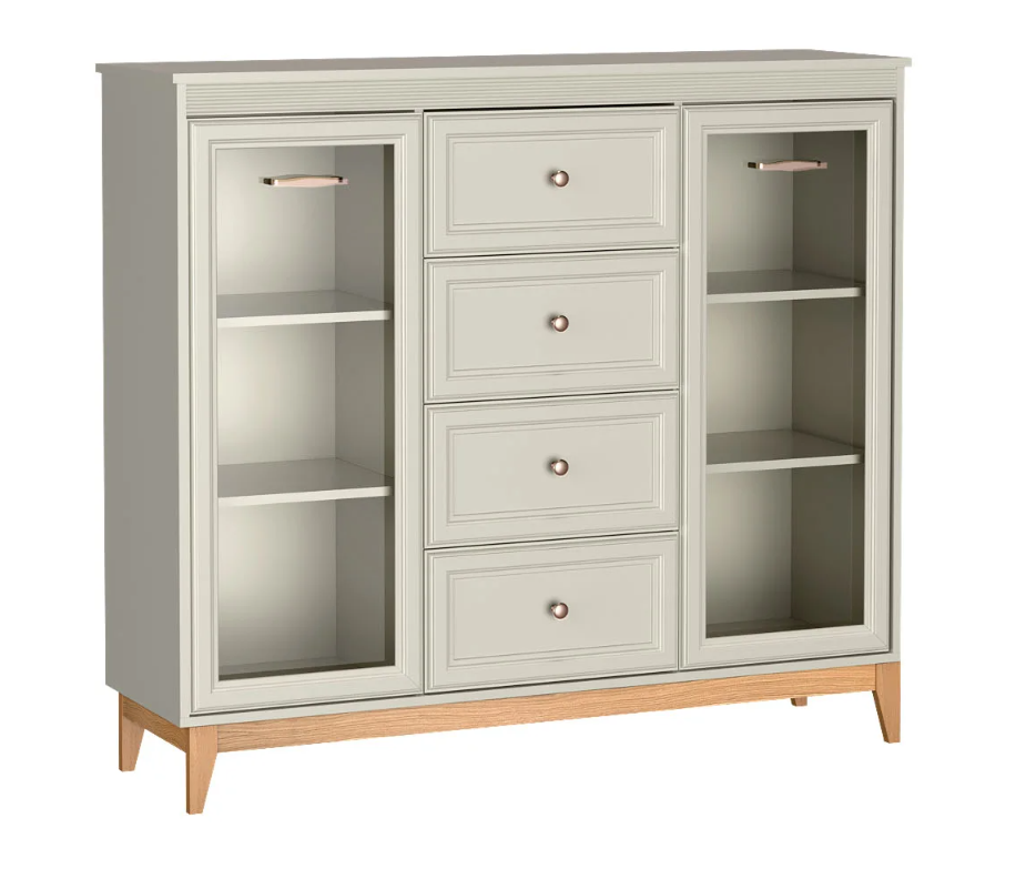 WINDSOR – 7 to elegancka i funkcjonalna witryna, która łączy klasyczną estetykę z nowoczesnymi rozwiązaniami. Jej subtelna kolorystyka w odcieniu kaszmiru, zestawiona z drewnianymi akcentami, tworzy harmonijną i przytulną atmosferę w każdym wnętrzu. Dzięki przemyślanemu układowi oraz wysokiej jakości wykonaniu, witryna doskonale sprawdzi się w salonie, jadalni czy gabinecie, pełniąc zarówno funkcję dekoracyjną, jak i praktyczną.