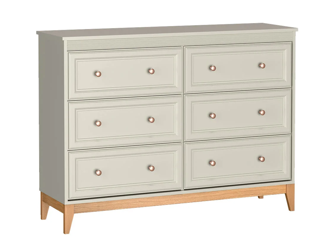 Jej subtelny odcień kaszmiru, w połączeniu z drewnianymi nogami w kolorze dębu naturalnego, tworzy elegancką i ponadczasową całość, która doskonale wpisuje się zarówno w klasyczne, jak i nowoczesne wnętrza. Stylowe złote, metalowe gałki dodają komodzie szlachetnego charakteru, podkreślając jej wyjątkowy design.