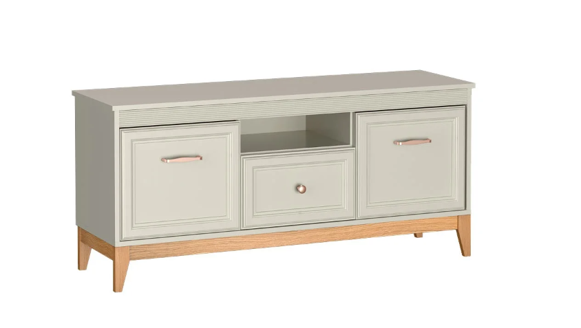 WINDSOR – 8 to stylowa i funkcjonalna szafka RTV, która łączy elegancję z nowoczesnymi rozwiązaniami. Jej subtelna kolorystyka w odcieniu kaszmiru, zestawiona z drewnianymi elementami, wprowadza do wnętrza ciepło i harmonię. Klasyczne detale i precyzyjne wykończenie sprawiają, że szafka doskonale komponuje się zarówno w tradycyjnych, jak i nowoczesnych aranżacjach salonu.