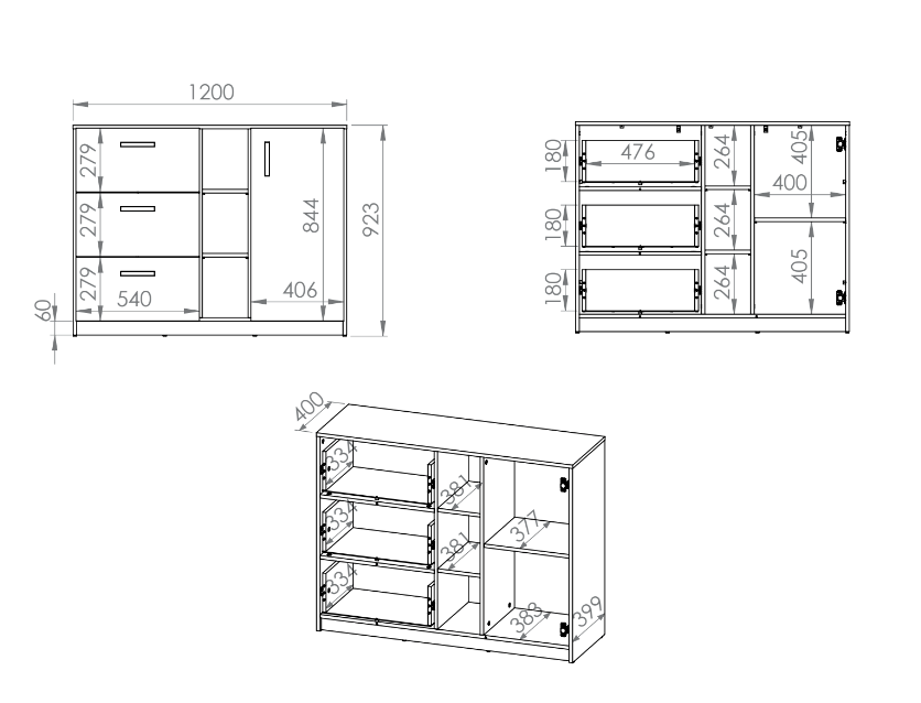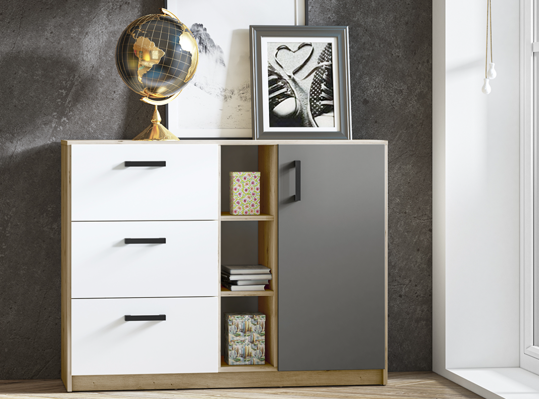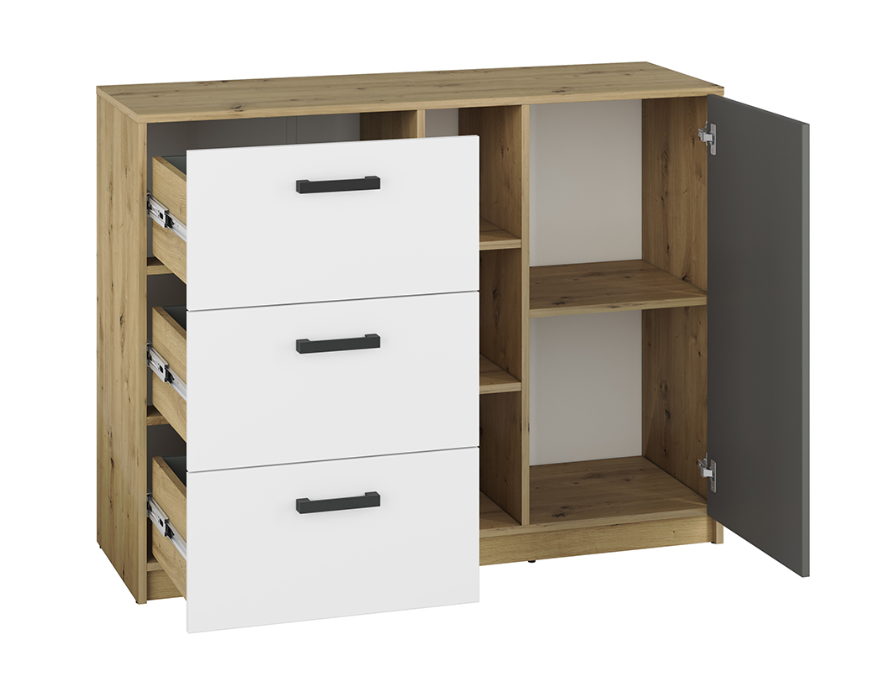 / Komoda Młodzieżowa 1- Drzwiowa z Szufladami 1D3SZ 120 cm Biały + Antracyt + Dąb Artisan FINKS 06 ML