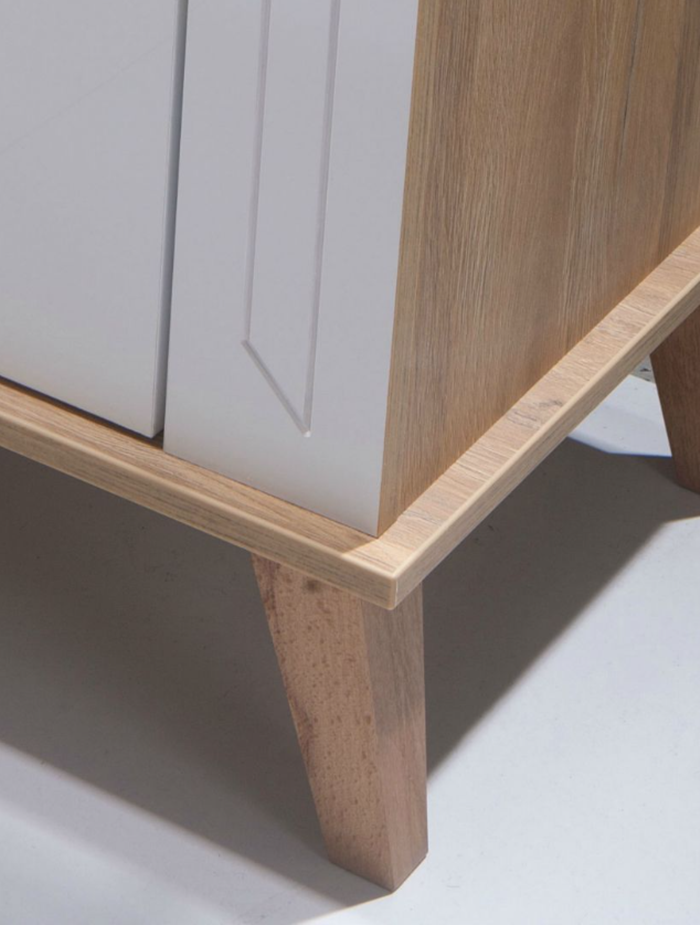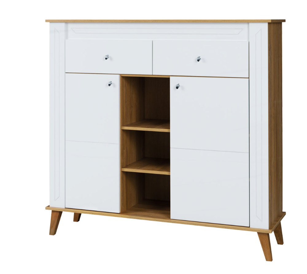 Nowoczesna komoda wysoka 2- drzwiowa z szufladami w stylu skandynawskim. Komoda została stworzona w dwóch wersjach kolorystycznych dąb grand oraz dąb grand + biały połysk. Dzięki możliwości wyboru koloru możemy stworzyć swój wymarzony zestaw, który nada niepowtarzalnego wyglądu naszego wnętrza.
