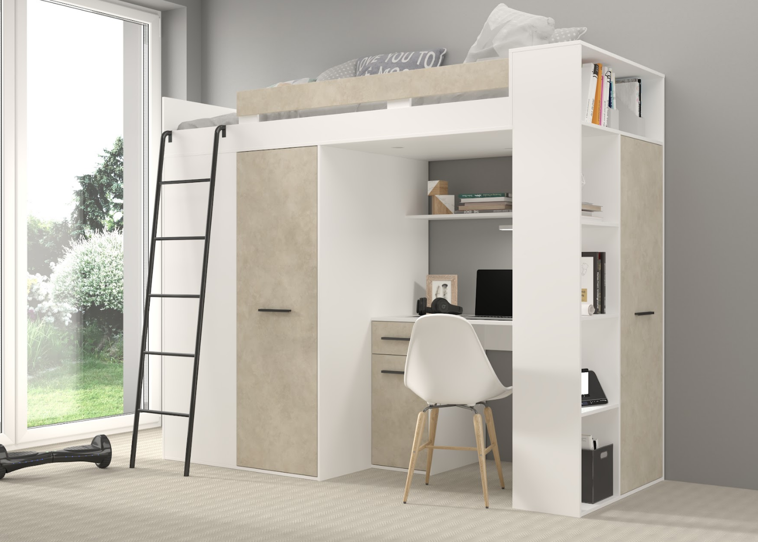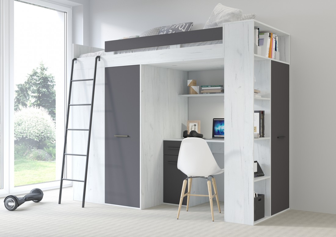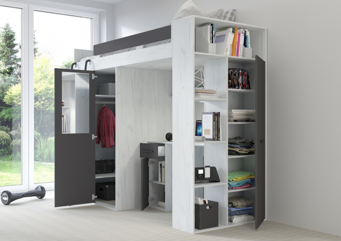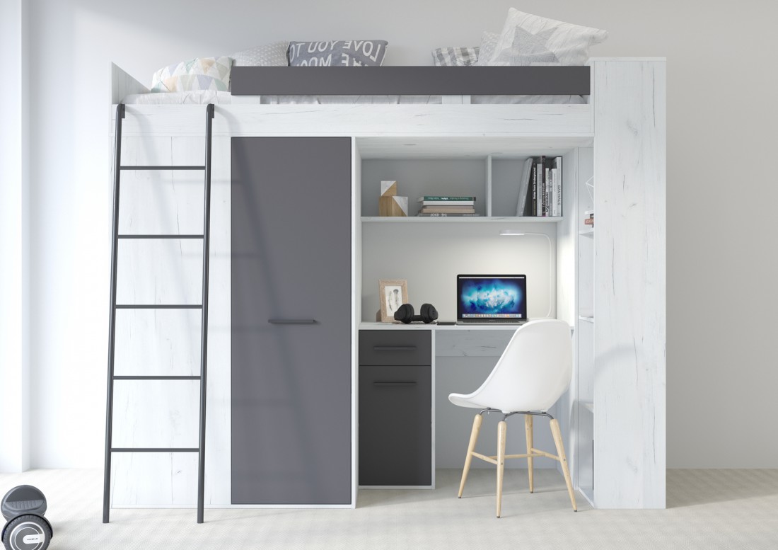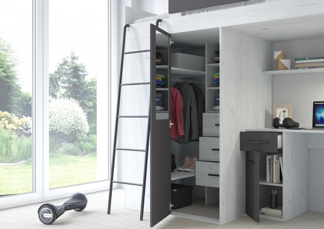 Łóżko piętrowe (antresola) z biurkiem oraz 2 szafami to świetna propozycja do pokoju dziecka czy nastolatka o nowoczesnym stylu.