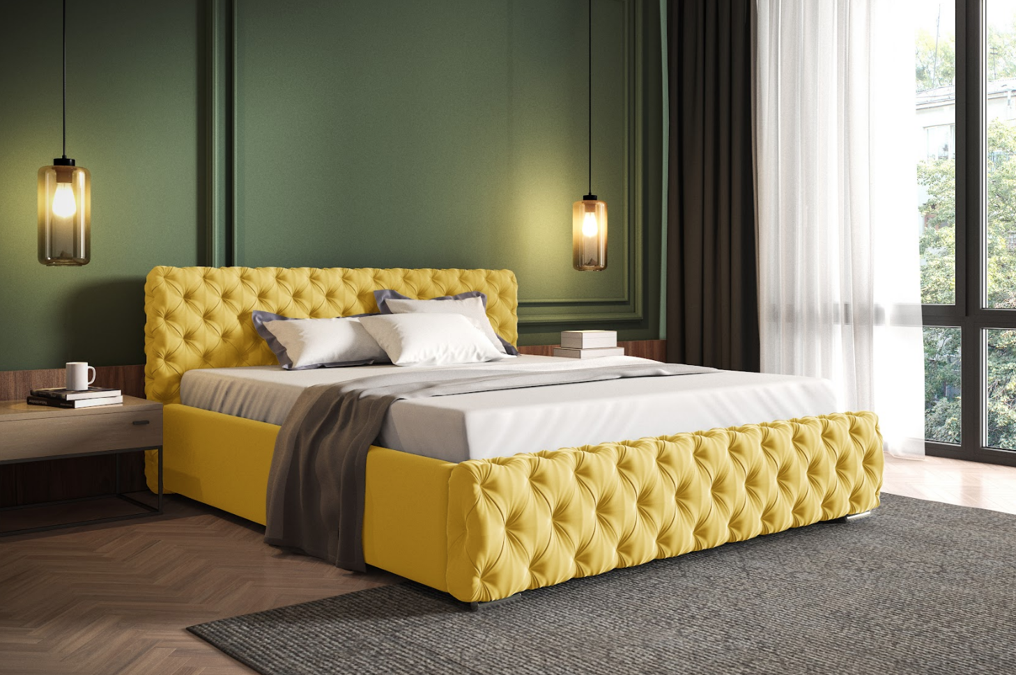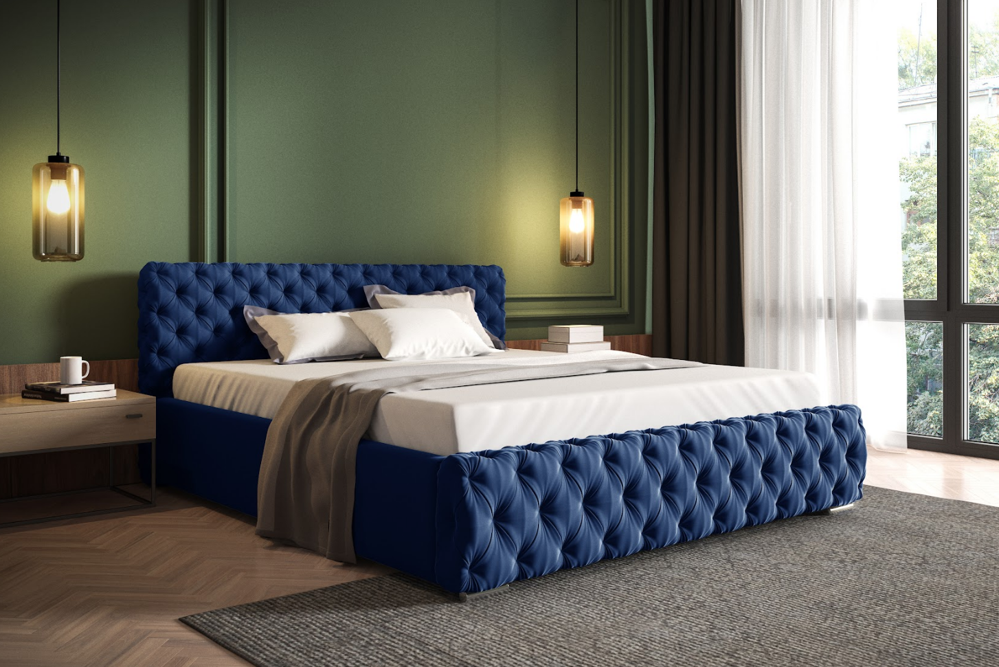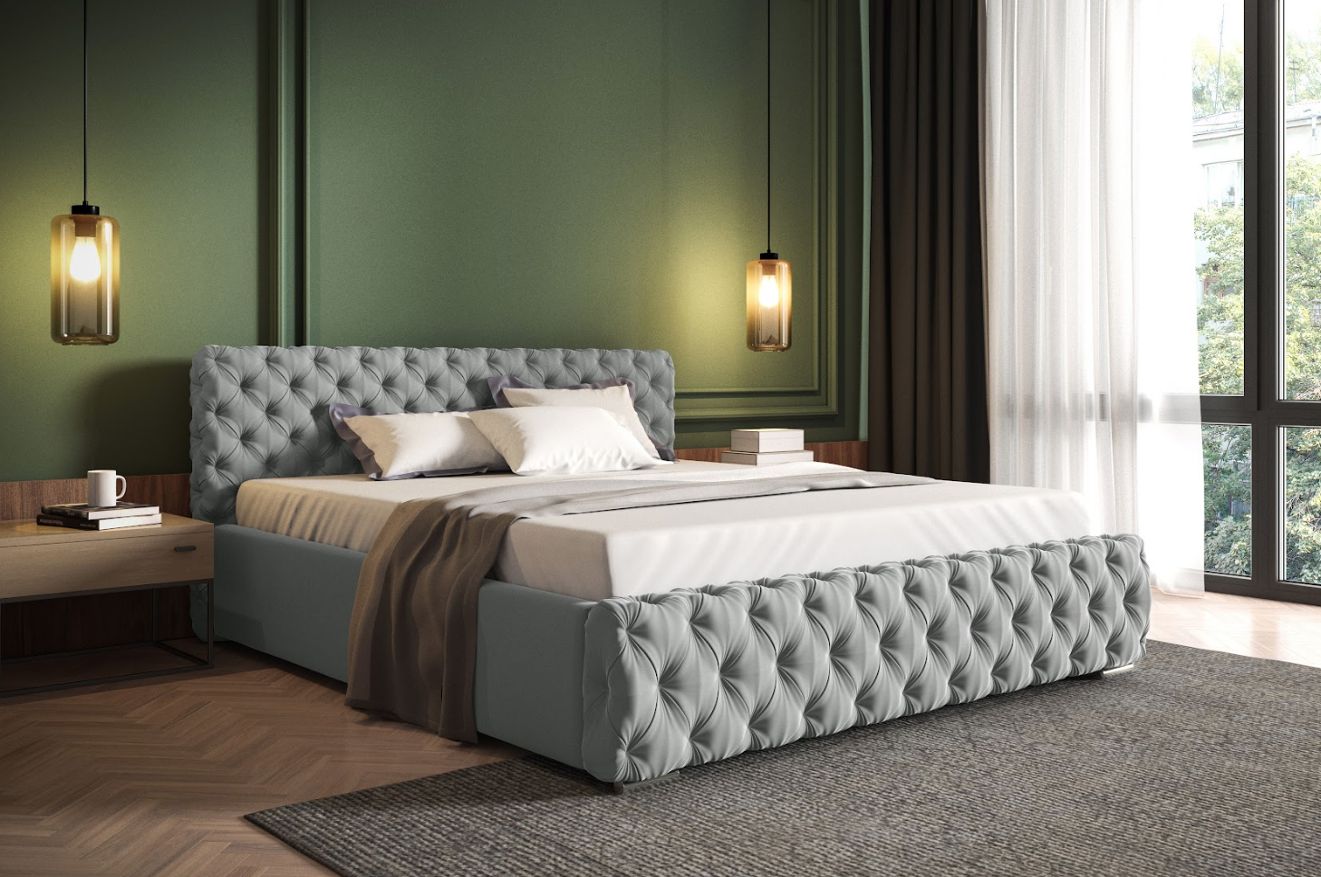 • Zagłówek profilowany i przód łóżka głęboko pikowany