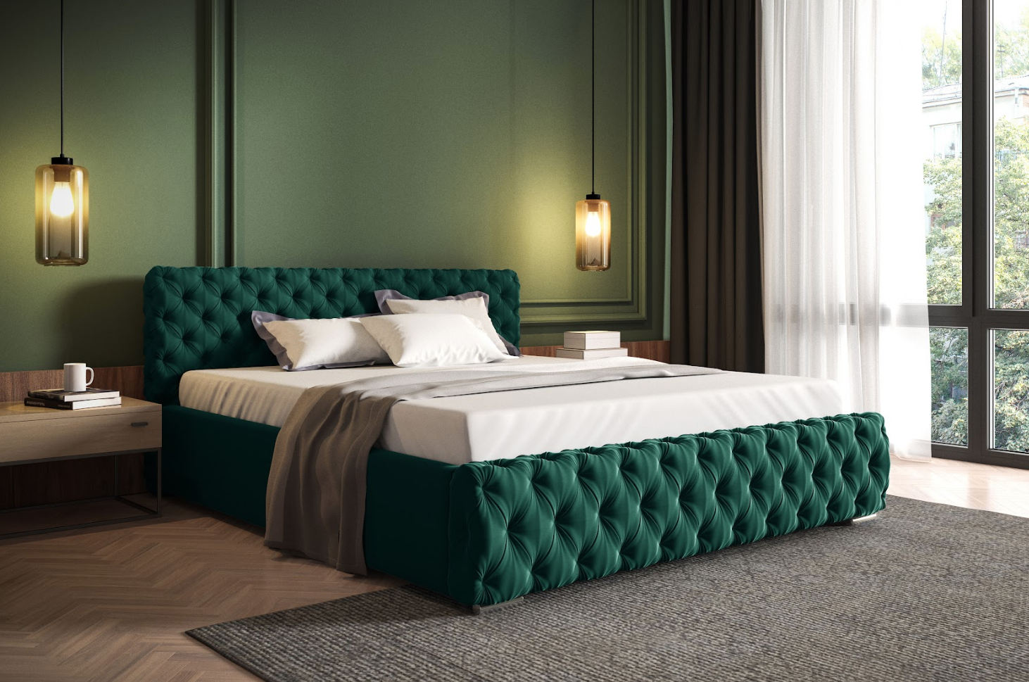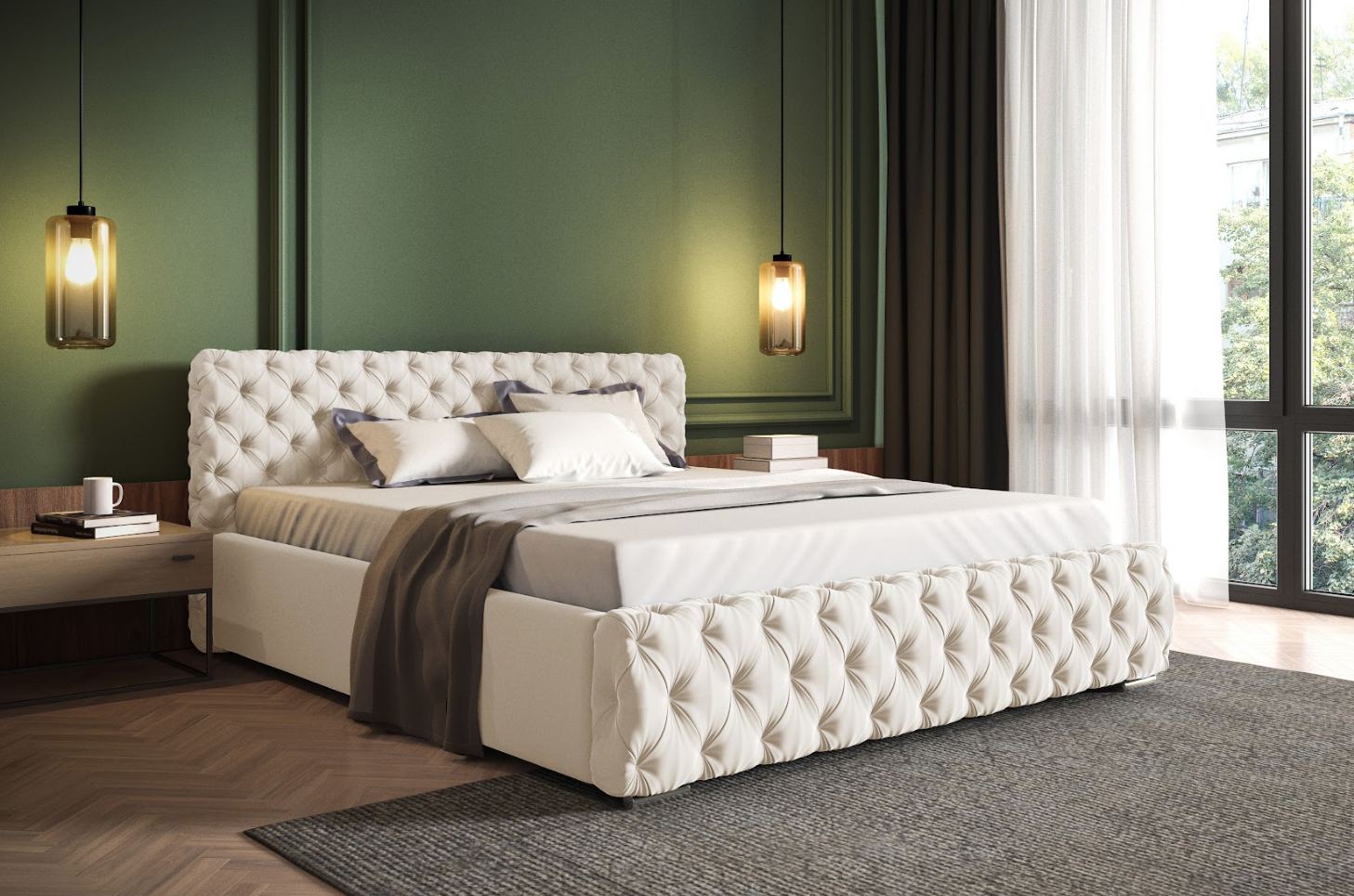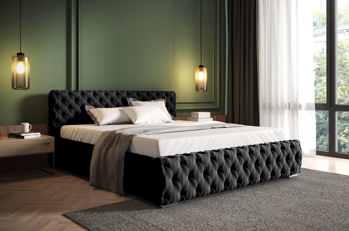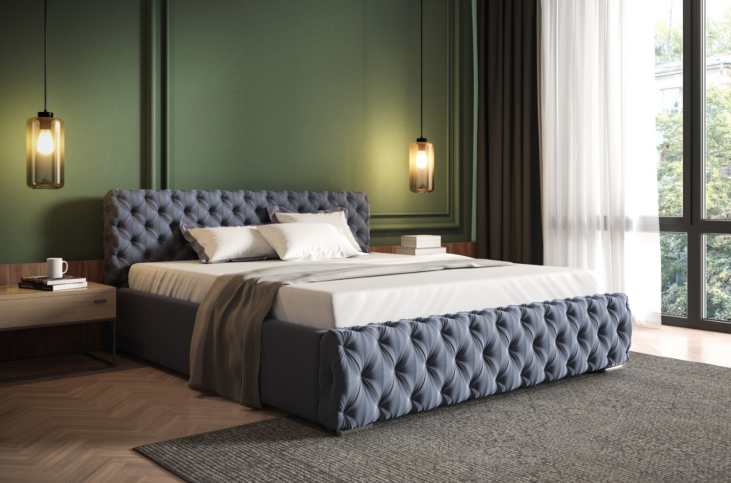 • Zagłówek profilowany i przód łóżka głęboko pikowany