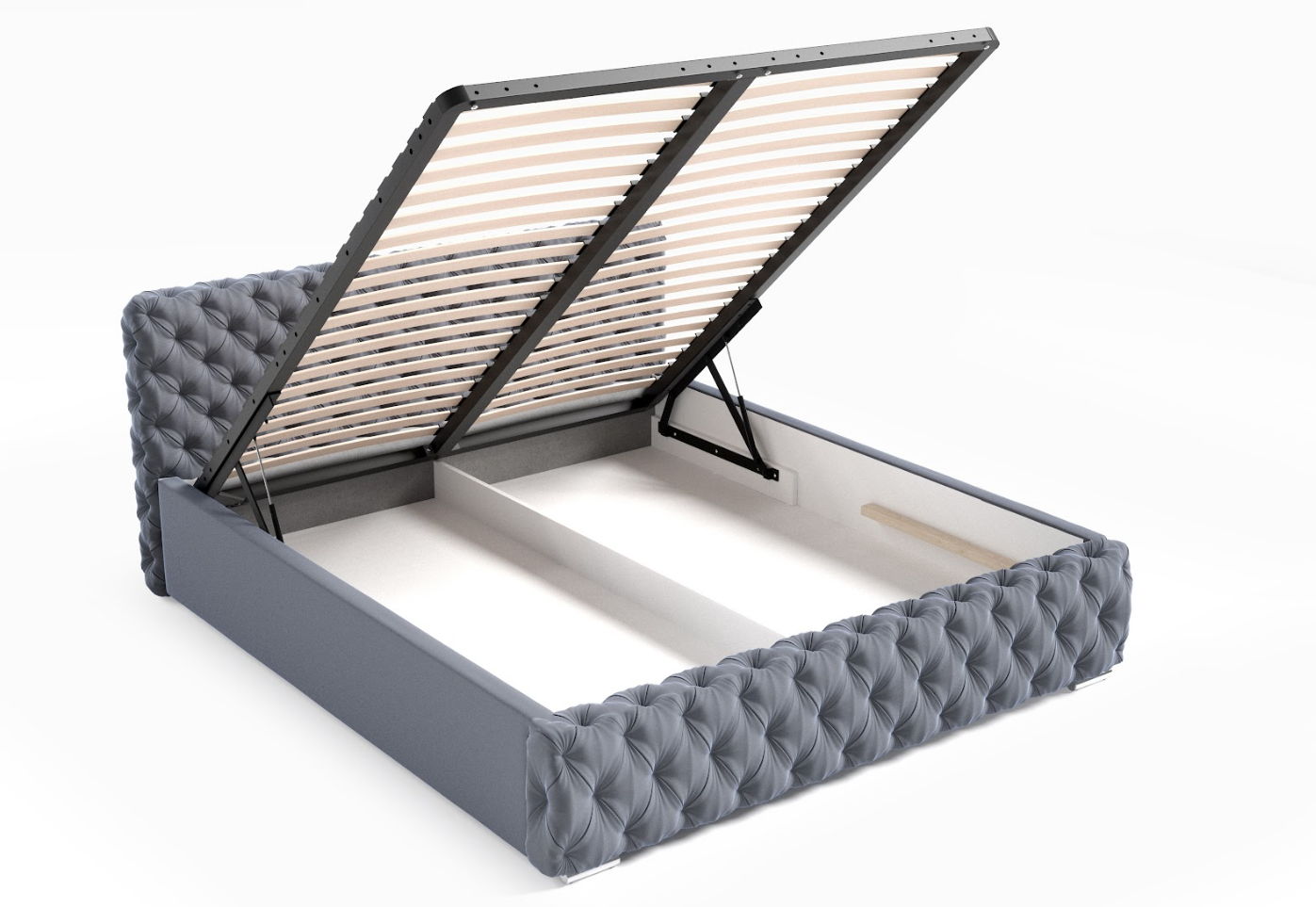 łóżko wraz ze stelażem, rama metalowa + siłowniki gazowe, pojemnik na pościel.