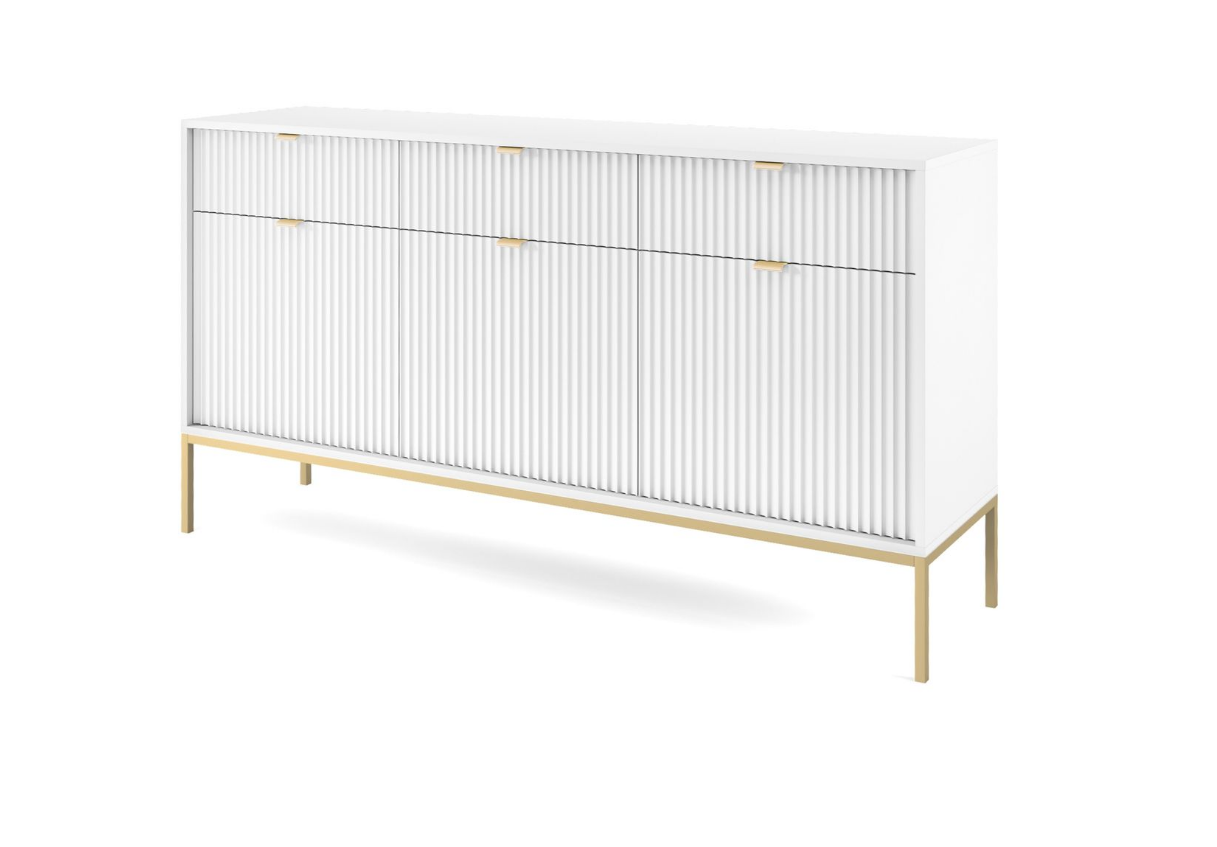 Meble z kolekcji NOVUM odznaczają się wyjątkowo nowoczesnym designem. Bryły meblowe posiadają uchwyty w kolorze złota co sprawia iż wnętrze staje się bardzo eleganckie.Podstawę stanowią złote lub czarne metalowe nogi