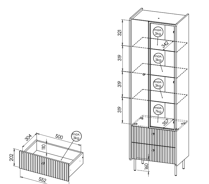 - witryna – szer 59 x wys 190,7 x gł 40 cm