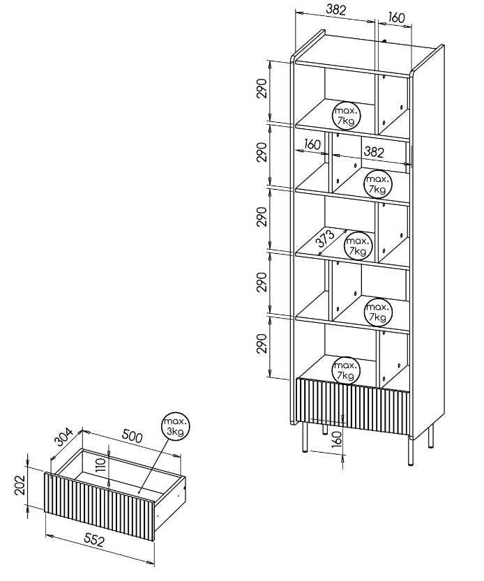 - regał otwarty – szer 59 x wys 190,7 x gł 40 cm