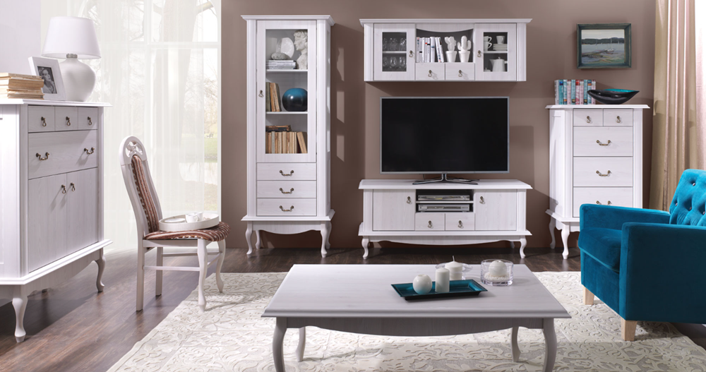 Meblościanka Ludwik została stworzona dla klientów lubujących się w eleganckim, klasycznym stylu. Dzięki swoim ozdobnym nóżkom i uchwytom meblościanka nabiera charakteru i doda domowego ciepła w każdym pomieszczeniu. Możemy nią urządzić salon czy pokój dzienny.