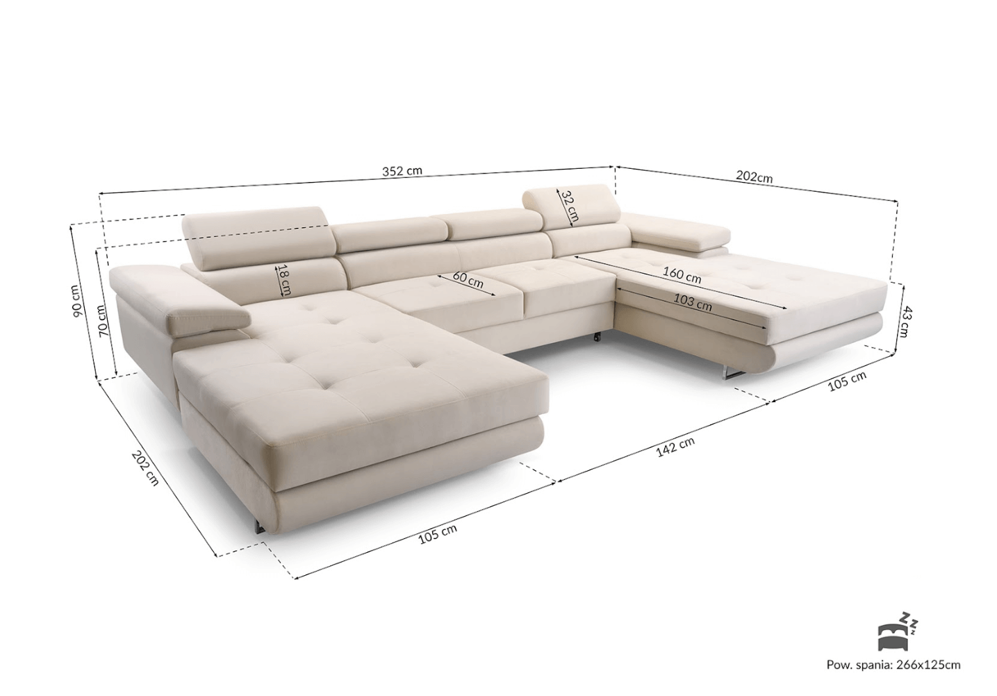 powierzchnia spania: 125 x 266 cm