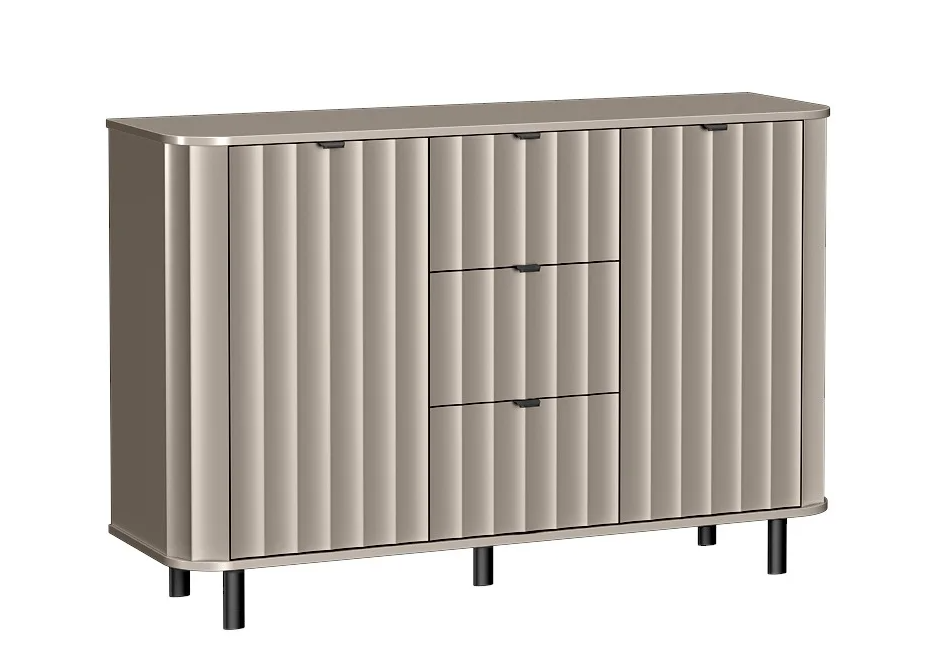 Komoda NOVADO – 1 to doskonałe połączenie elegancji i funkcjonalności, które sprawdzi się w nowoczesnych wnętrzach. Dzięki symetrycznej budowie – z trzema pojemnymi szufladami w środkowej części oraz dwoma szafkami z półkami po bokach – zapewnia wygodne przechowywanie różnorodnych przedmiotów. Idealna do salonu i sypialni.