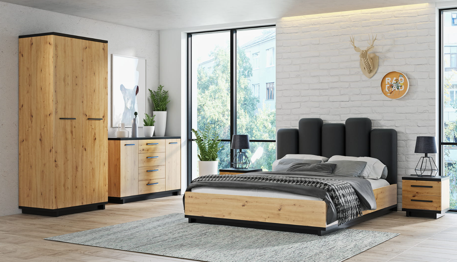 Zestaw mebli IGA został zaprojektowany zarówno z myślą o sypialni, jak i pokoju dziennym. Jej elementami charakterystycznymi są cokoły stanowiące podstawę mebli oraz grube, czarne blaty. Wybarwienie, jakiego użyliśmy, to Dąb Artisan z charakterystycznymi dla tego motywu sękami.