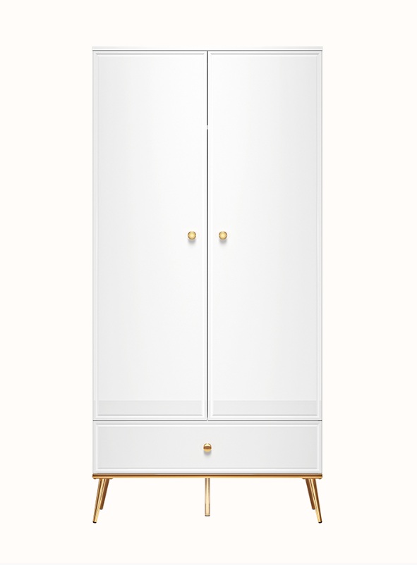 Nowoczesna szafa w stylu skandynawskim. Pięknie dopasowana kolorystyka bieli z dodatkami złotego rozświetli każde pomieszczenie. Szafa GILDEN jest funkcjonalna i pomieści wiele ubrań. Delikatne uchwyty dodają jej lekkości, zaś skośne nóżki dodają elegancji.