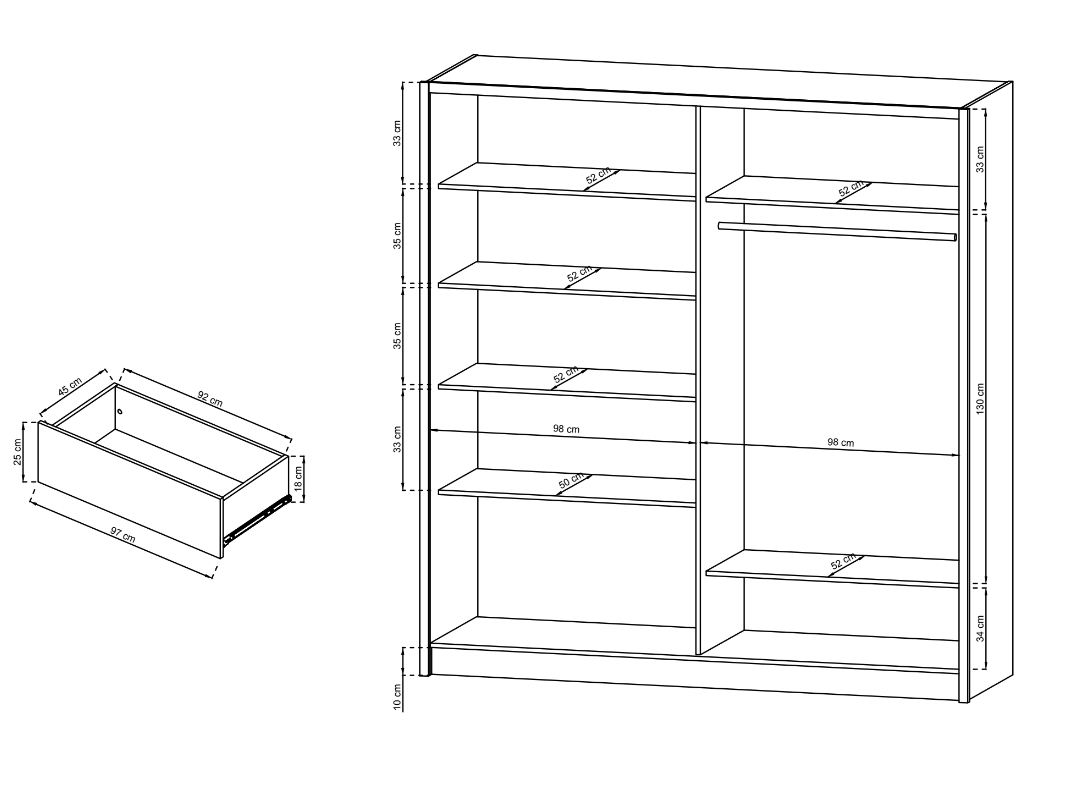 - Szafa posiada 1x drzwi przesuwne z lustrem, oraz 2x drzwi uchylane