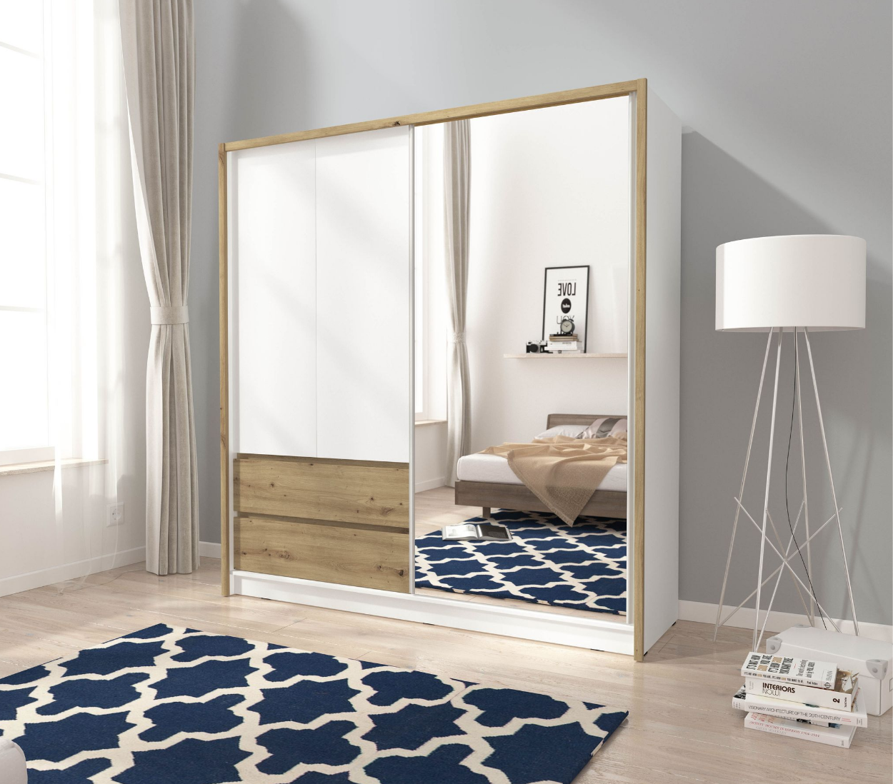 - korpus : biały mat / fronty biały mat + dąb artisan + lustro