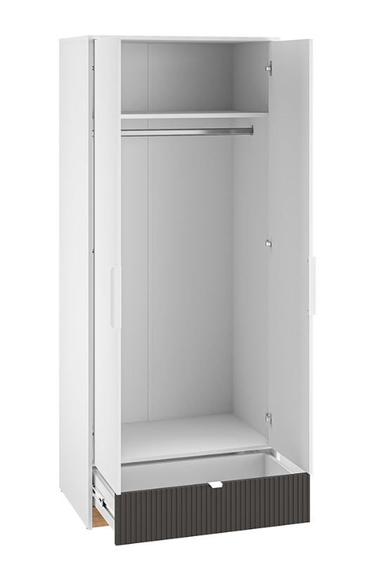 Nowoczesna szafa to podstawowy mebel w każdym pokoju młodzieżowym, dlatego w systemie TORRO została stworzona funkcjonalna dwudrzwiowa szafa. Za frontami na długim drążku dziecko może powiesić dłuższe ubrania lub koszulki, a na półkach poukładać resztę ubrać. A na dole w szafie dodano pojemną szufladę, w której można pochować resztę rzeczy. Kolorystyka mebla została dobrana tak, aby szafa pasowała do pokoju chłopca i dziewczynki.