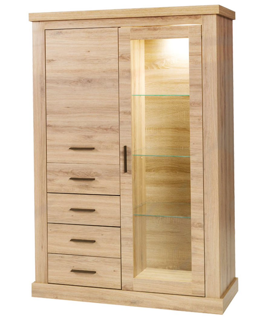 Nowoczesna witryna 2- drzwiowa z szufladami, w trzech wersjach kolorystycznych rozświetli każdy pokój dzienny czy salon. Dzięki większym uchwytom witryna nabiera charakteru pięknie aranżując nasze wnętrze.