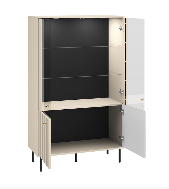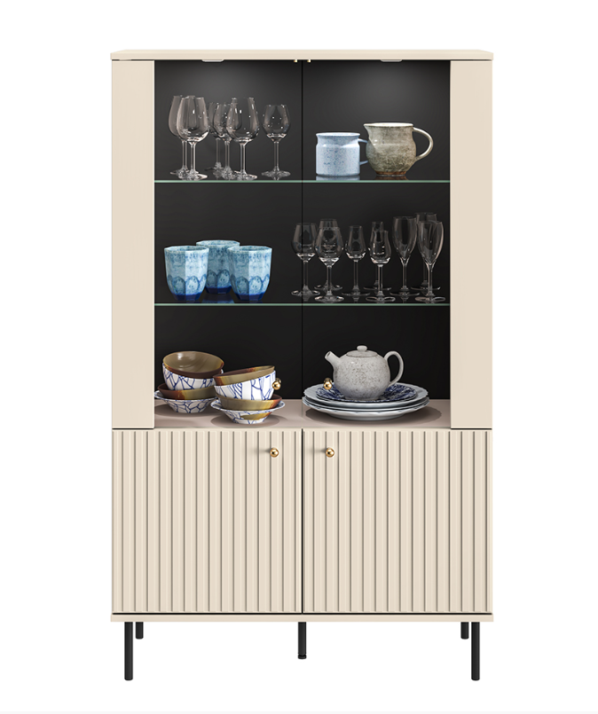 Witryna Zofia to mebel, dzięki któremu wyeksponujesz to co lubisz. Dwie szklane półki dzielą przestrzeń za podwójnymi, przeszklonymi drzwiami na trzy szerokie wnęki, w których postawisz swoją kolekcję porcelany czy pamiątki z podróży. Górne, ledowe oświetlenie dodatkowo położy akcent na Twoje ulubione przedmioty oraz rozjaśni całe wnętrze. Kolejnym miejscem do przechowywania jest pojemna półka schowana za frontami z płyty MDF. Witryna Zofia to nie tylko funkcjonalność. Nasz mebel to synonim współczesnej elegancji. Kaszmirowy dekor, frezowane fronty MDF, gałki w kolorze szczotkowanego złota oraz dyskretne czarne nóżki to kwintesencja całej kolekcji Zofia.