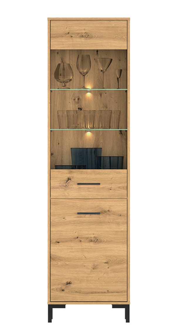 Prosta witryna świetnie ociepli wnętrze po przez zastosowany bardzo modny dekor Dąb Artisan. Czarne uchwyty kontrastują z drewnianymi frontami, a jednocześnie współgrają z prostymi nóżkami w tym samym kolorze, nadając witrynie nowoczesnego i zarazem eleganckiego wyglądu. Witryna NIVA to nowoczesny i elegancki mebel do salonu, pokoju dziennego czy sypialni, który wpisuje się zarówno w loftowy jak i klasyczny styl.