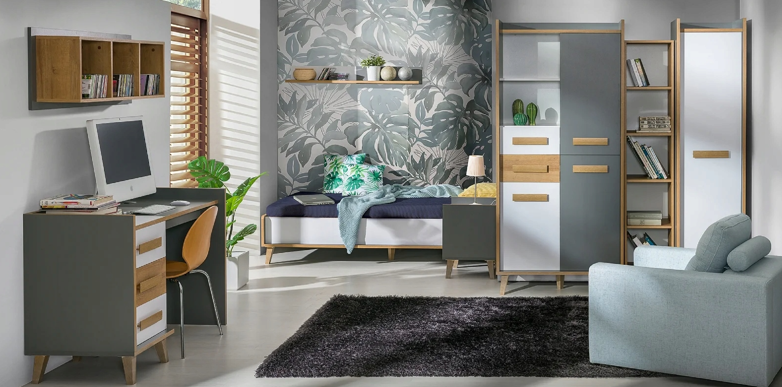 Kolekcja WERSIMO została zaprojektowana w połączeniu trzech kolorów: Biały + Antracyt oraz Dąb Riviera. Drewniane nóżki dodają meblom lekkości, co sprawia, że nawet w niewielkich pomieszczeniach będą prezentować się bardzo dobrze. Kolorystyka mebli sprawia, że będą pasować do pokoju dziewczynki jak i chłopca. System WERSIMO jest funkcjonalny i łatwy w utrzymaniu czystości.
